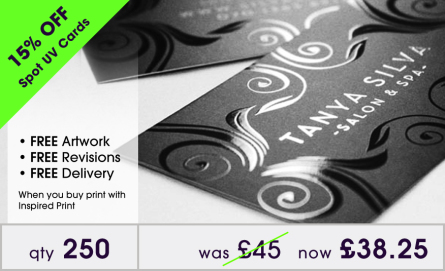 Add our new GLOSS FX super gloss SPOT UV effect. Applied over Matt Lamination this gives a stunning contrast between super flat matt lamination and super glossy spot UV on 400gsm card. Here at Inspired Print, we offer the most cost effective SPOT UV service thanks to our investment in the latest cutting edge high-speed inkjet UV application, delivery superior SPOT UV over the traditional process. And as if all that wasn’t enough, our new SPOT UV process is kinder to the environment using up to 80% less energy and generating no nasty pollutants to boot!